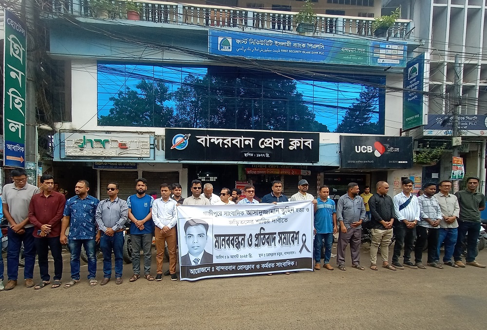 মানববন্ধনে সাংবাদিকরা বলেন, দৈনিক প্রতিদিনের কাগজ পত্রিকার গাজীপুরের স্টাফ রির্পোটার আসাদুজ্জামান তুহিন সন্ত্রাসীদের হাতে নৃশংসভাবে হত্যার শিকার হন। এই দায় রাষ্ট্র এড়িয়ে যেতে পারে না। খুব দ্রুতই সাংবাদিক তুহিন হত্যার ঘটনায় জড়িতদের গ্রেফতার করে বিচারের আওতায় নিয়ে আসতে হবে।