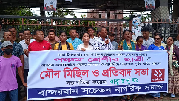 বান্দরবানের রুমায় স্কুল শিক্ষার্থীকে সংঘবদ্ধ ধর্ষণের প্রতিবাদে ও আসামীদের দ্রুত গ্রেপ্তার করে শাস্তির দাবিতে মৌন মিছিল ও সভা করেছে সচেতন নাগরিক সমাজ।