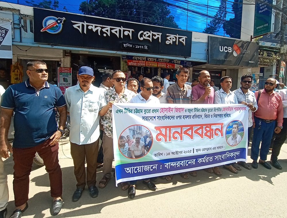 চট্টগ্রামে পেশাগত দায়িত্ব পালনকালে পুলিশ কর্তৃক এখন টিভির চট্টগ্রাম ব্যুরো প্রধান হোসাইন জিয়াদ ও যমুনা টিভির চট্টগ্রাম ব্যুরো রির্পোটার জোবাইয়াদ শাহাদাতকে লাঞ্চিত করার প্রতিবাদে বান্দরবান জেলা সদরে কর্মরত সাংবাদিকগণ বিক্ষোভ সভা ও মানববন্ধন করেছে।
