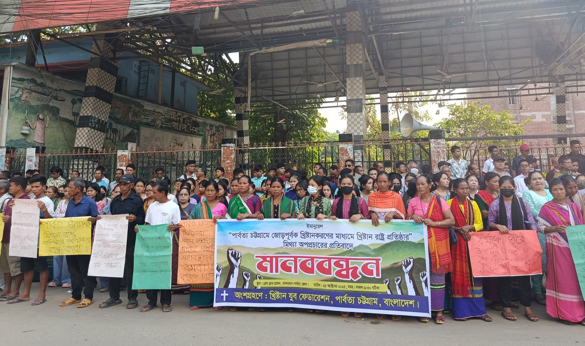 খ্রিষ্টান রাষ্ট্র বানানোর ষড়যন্ত্র হচ্ছে- এমন অভিযোগে একটি আবাসিক হোটেল ঘেরাও করা এবং জোরপুর্বক খ্রিস্টান বানানোর অপবাদ দিয়ে বান্দরবানে মানববন্ধনের প্রতিবাদ করেছে খ্রিষ্ট ধর্মাবলম্বী বিভিন্ন জনগোষ্ঠী।